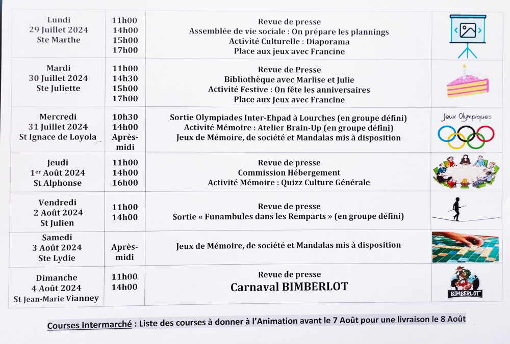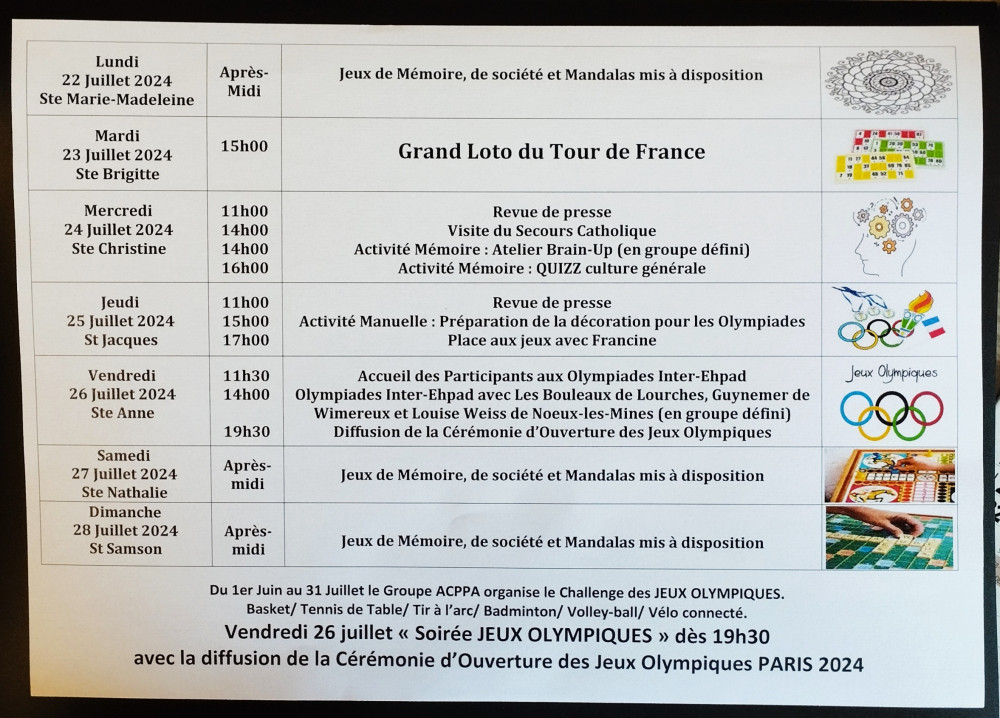 Bonjour à toutes et tous, LOTO du Tour de France, Olympiades inter-Ehpad et Cérémonie d'Ouverture des jeux Olympiques au programme cette semaine.
