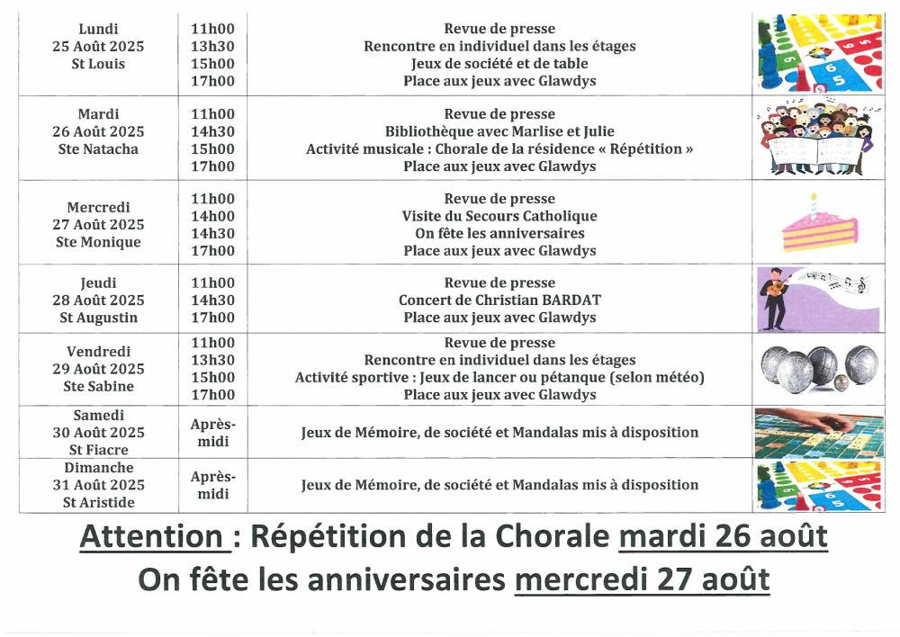 ATTENTION: Exceptionnellement la répétition de la chorale se fera MARDI 26 pour pouvoir fêter les anniversaires du mois Mercredi 27