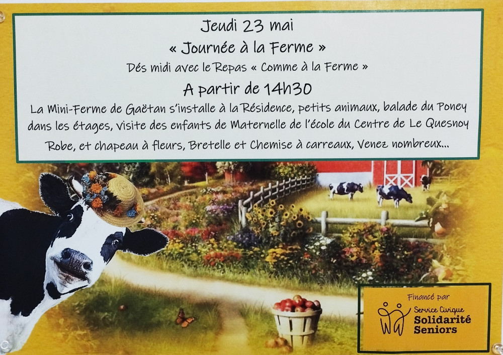Le jeudi 23 mai, nous vivrons une « journée à la ferme ». Dès le midi, avec un repas « comme à la ferme ».