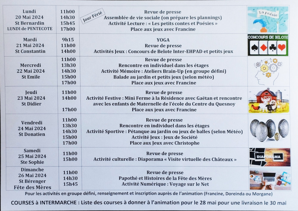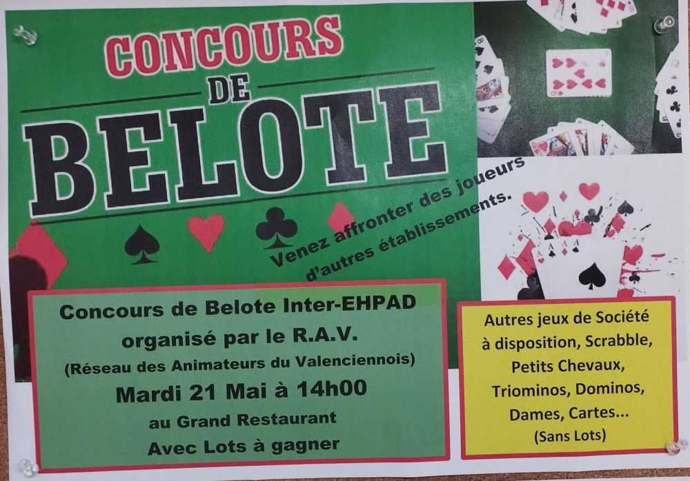La Résidence Harmonie accueillera, le mardi 21 mai à 14 heures, un Concours de Belote Inter-EHPAD, organisé avec le Réseau des Animateurs du Valenciennois. Ce concours sera doté de lots.