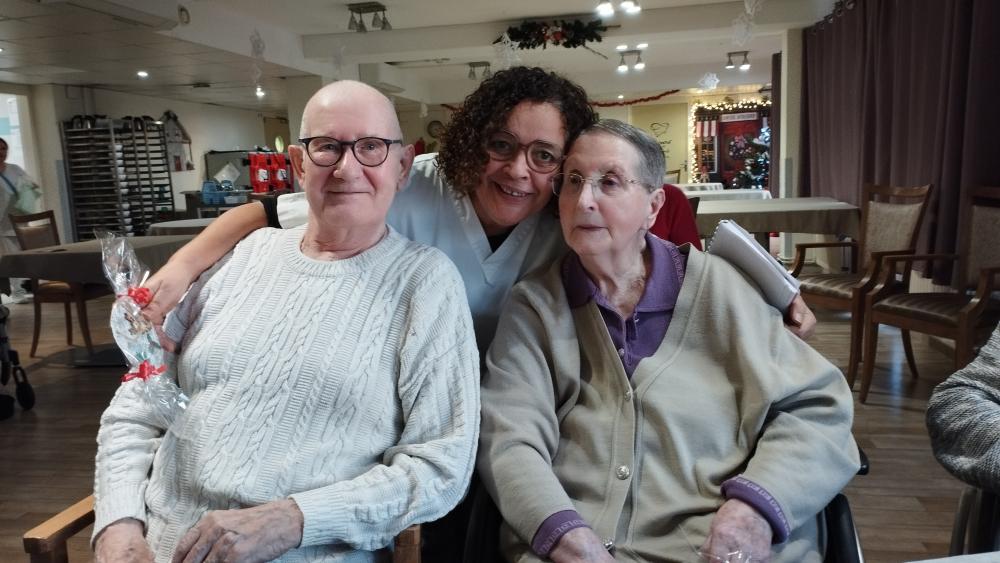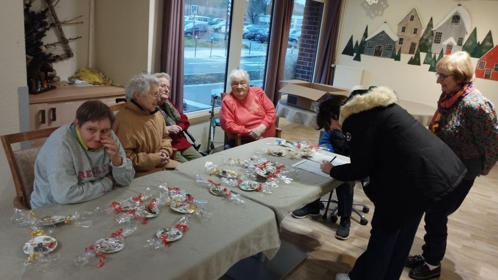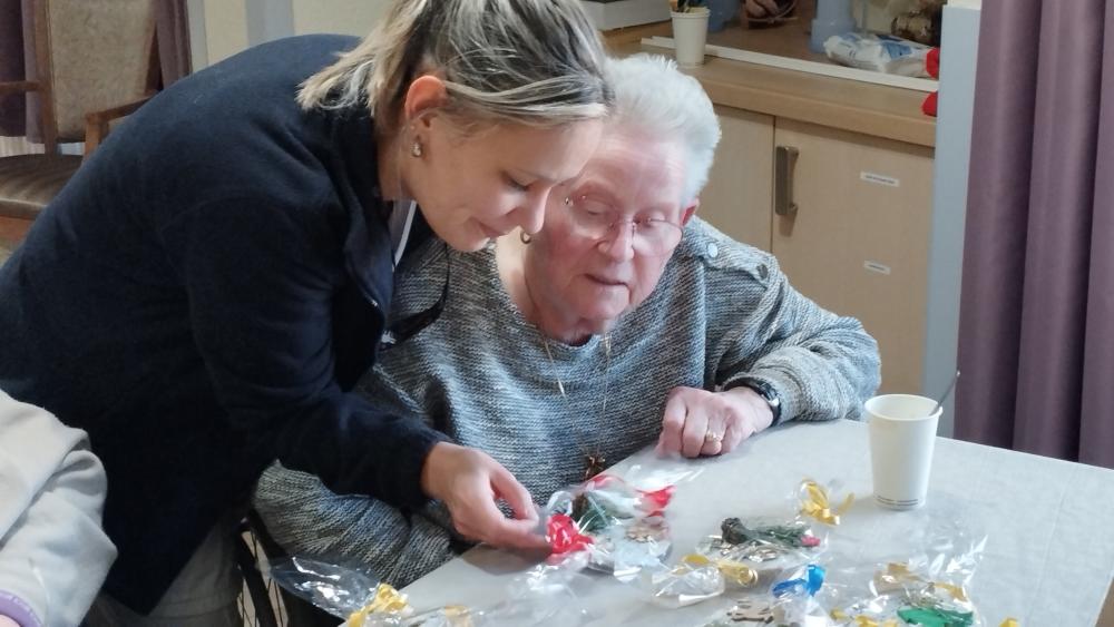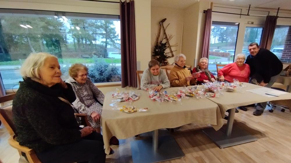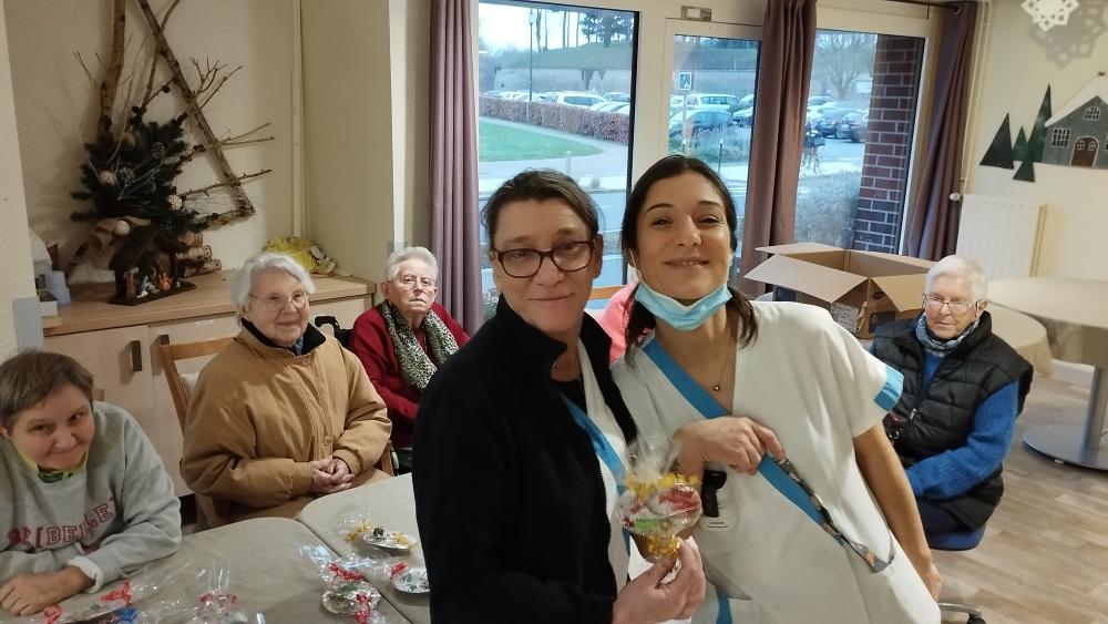 Des résidents aidés des bénévoles ont préparé des cadeaux pour le personnel afin de les remercier de leur engagement au quotidien. Ils ont créé des boules de noël à suspendre.