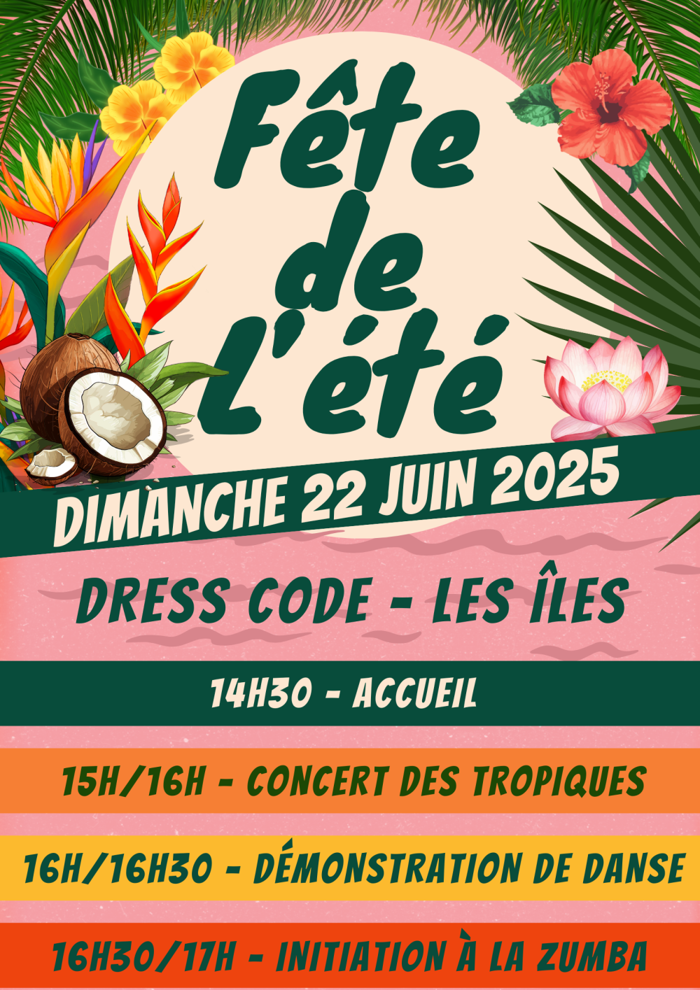 Cette année, cap sur les îles tropicales ! Ambiance chaleureuse, musique ensoleillée, rythmes exotiques… Nous vous attendons nombreux pour partager un bel après-midi festif !