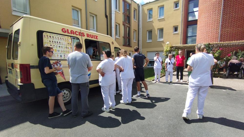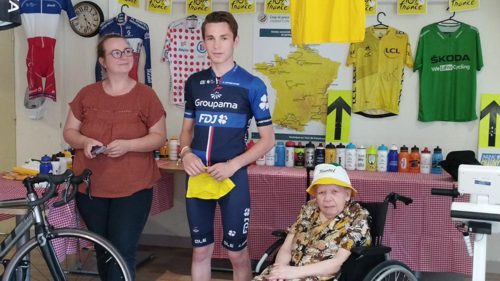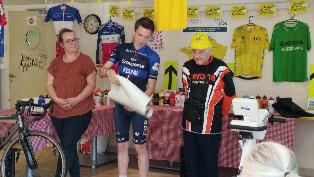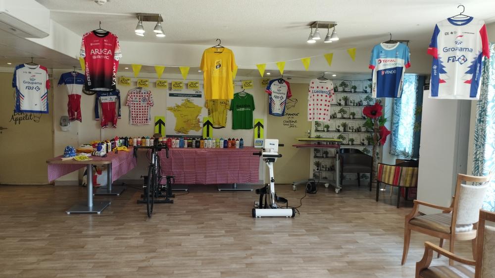 Challenge réussi... François cycliste amateur et bénévole est venu comme chaque année pédaler pour le Tour de France. Nouveauté cette année, les résidents ont pu pédaler aussi et tenter de remporter le maillot jaune de la caravane (Kiosque officiel) et casquette LCL pour le 1er, Bob TDF et affiche pour le 2ème et Casquette la Vache qui rit pour la 3ème. Bravo à tous. Total: 74 KM