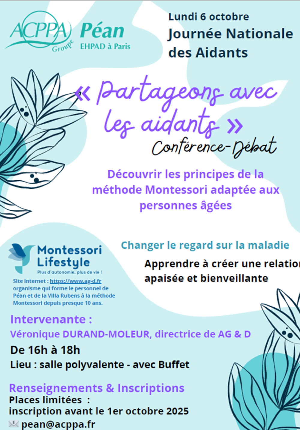 A l'occasion de la journée nationale des aidants qui se déroulera le 6 octobre prochain, nous vous invitons à la Conférence débat sur la Méthode Montessori adaptée aux personnesAfficher la suite
