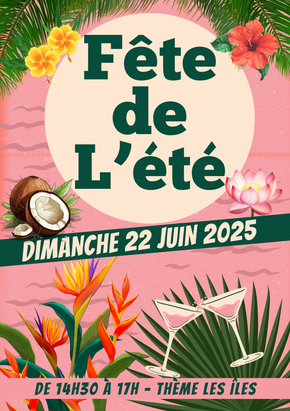 Cette année, cap sur les îles tropicales ! Ambiance chaleureuse, musique ensoleillée, rythmes exotiques… Nous vous attendons nombreux pour partager un bel après-midi festif !