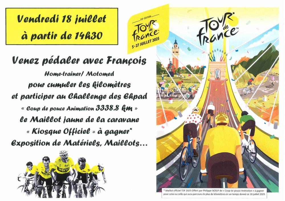 Vendredi 18 juillet venez pédaler avec François et cumuler les kilomètres pour le Challenge "Coup de pouce Animation" Maillot jaune "kiosque officiel" à gagner. Exposition de matériels et maillots