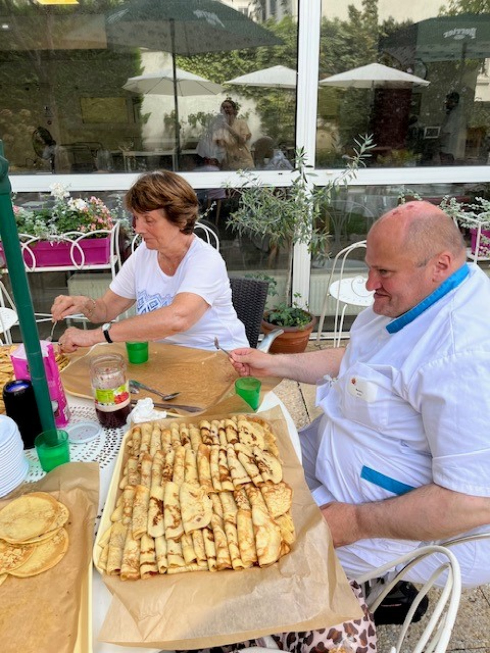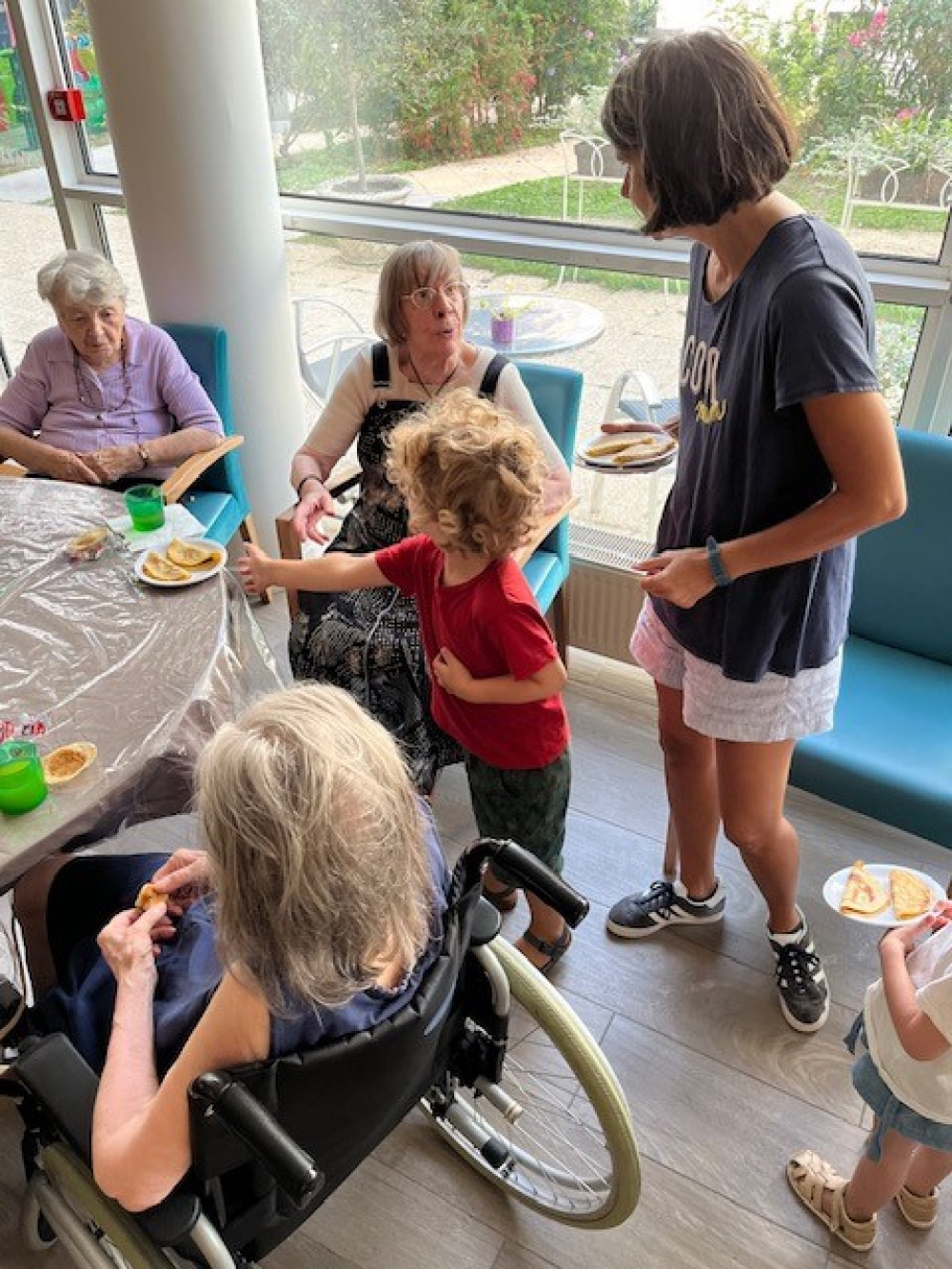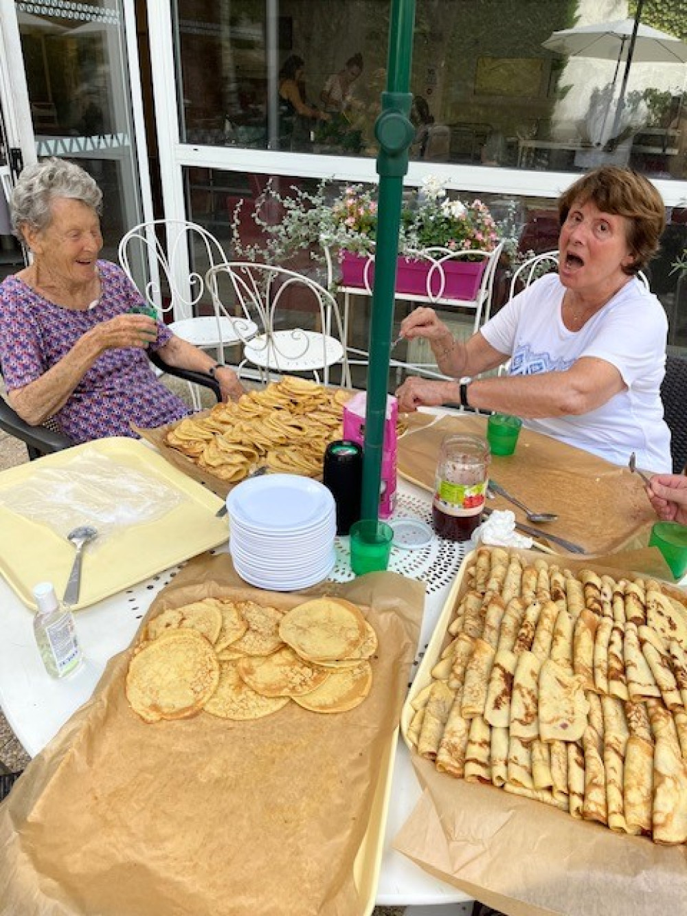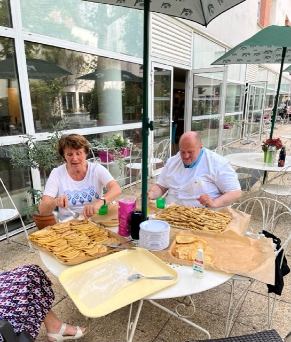 Ce mercredi 23 août, malgré la chaleur, nous avons fait revenir les crêpes à Péan, en compagnie des petits de la crèche, revenus de vacances. Pour éviter les désagréments que causent la chaleur, les crêpes sont directement venues aux résidents dans les étages avec un chariot. Pour les résidents présents au rez-de-chaussée, ce sont les enfants qui ont fait la distribution. Un grand merci à Nicole, Odile, Sandra et Benoit pour le garnissage, et Alice pour le coup de main à la cuisson !