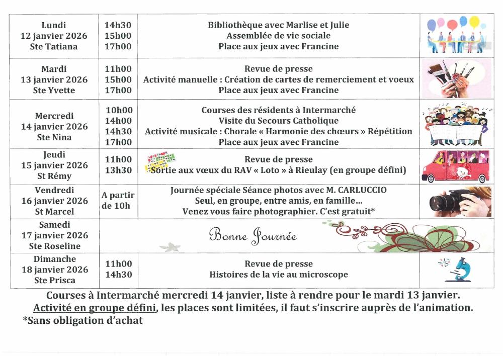 Cette semaine, passage de la bibliothèque exceptionnellement LUNDI 12 janvier. Jeudi, sortie pour un Loto avec le R.A.V. (Réseau des animateurs du Valenciennois) à Rieulay. Vendredi toute la journée, séance photos avec Mr Carluccio. Bonne semaine.