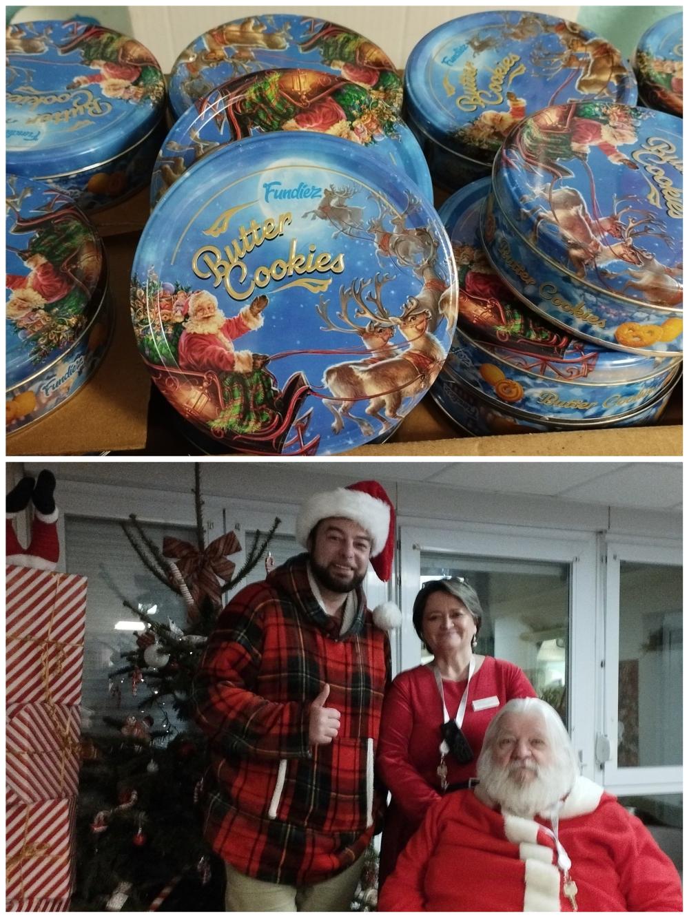 En ce jour de Noël c'est les bras chargés de cadeaux que le Père Noël est passé à la résidence. Il a apporter des boites de biscuits de Noël que la mère Noël a distribué.