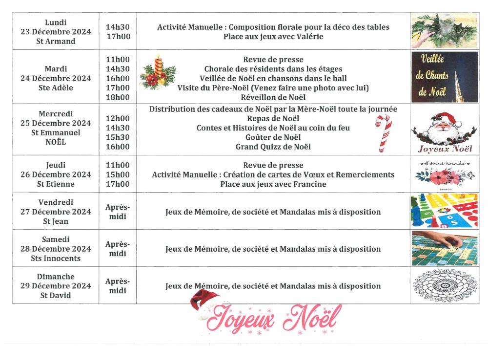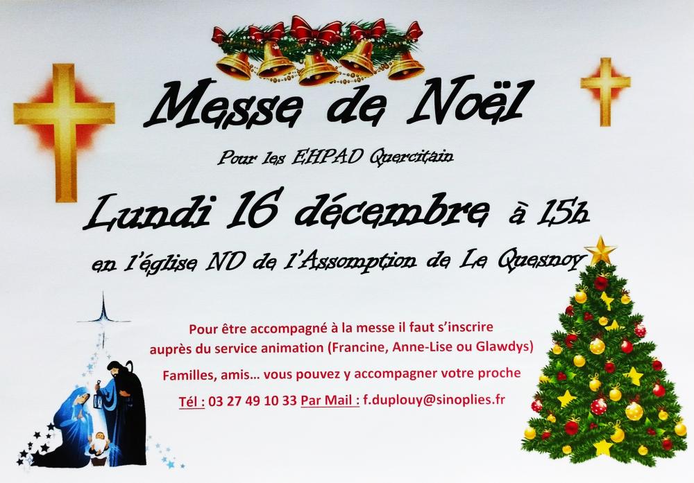 La paroisse St Jean Bosco organise une messe de Noël pour les EHPAD ce lundi 16 décembre à 15h en l'église Notre Dame de l'Assomption du Quesnoy. Si vous voulez y participer il est nécessaire de vous inscrire auprès de l'animation (Francine) afin d'assurer votre transport jusqu'à l'église. Parents, proches, amis vous pouvez y accompagner votre proche.