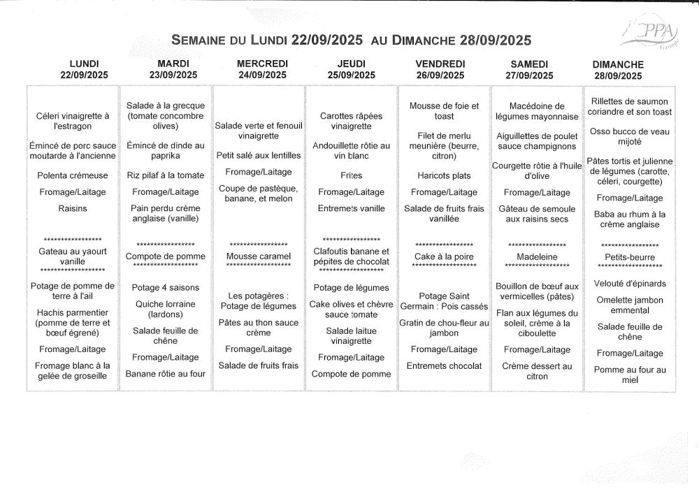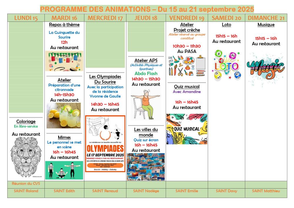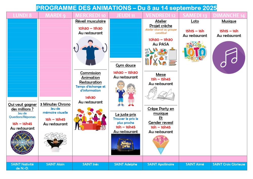 PROGRAMME DES ANIMATIONS ET MENU DU RESTAURANT – Du 22 au 28 septembre 2025