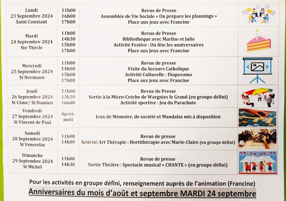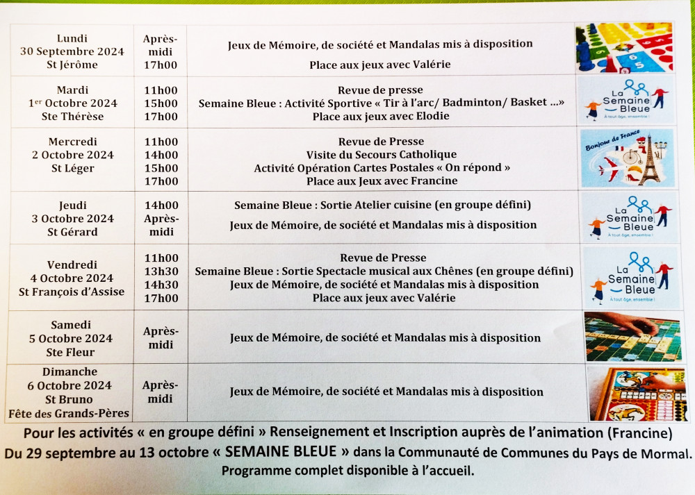 La semaine bleue du 29 septembre au 13 octobre pour la Communauté de communes du Pays de Mormal. Programme complet à l'accueil. Dimanche 6 octobre c'est la Fête des Grands-Pères