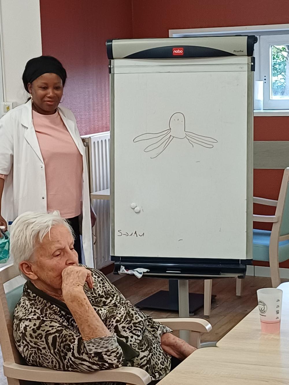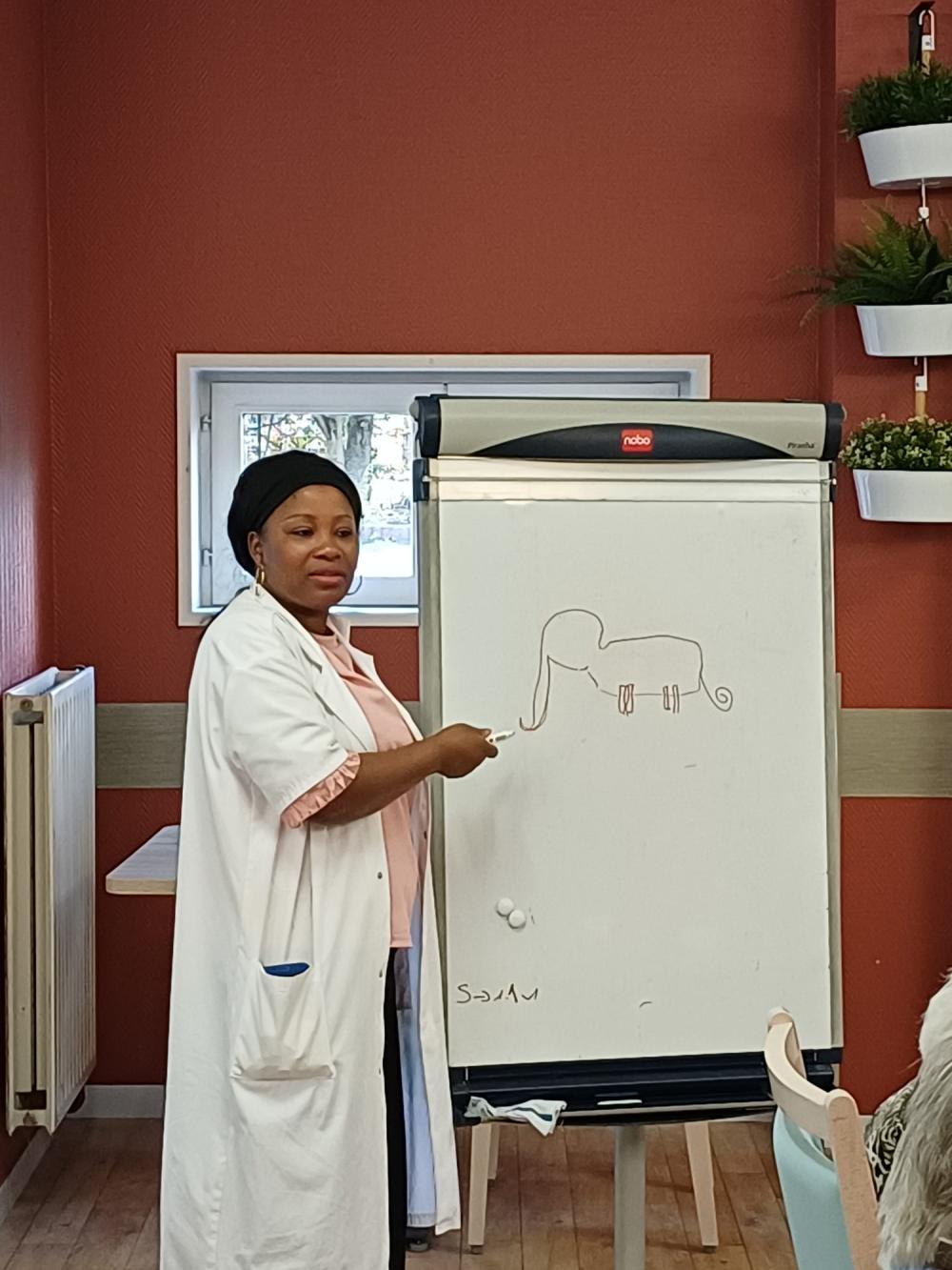 Quand notre cadre de santé se met derrière le tableau avec un crayon🙃🤔🤔 Faire deviner les dessins devient  un vrai travail pour nos méninges 🤣🤣🤣... les fous rires sont de mises!!! Bravo à notre IDEC