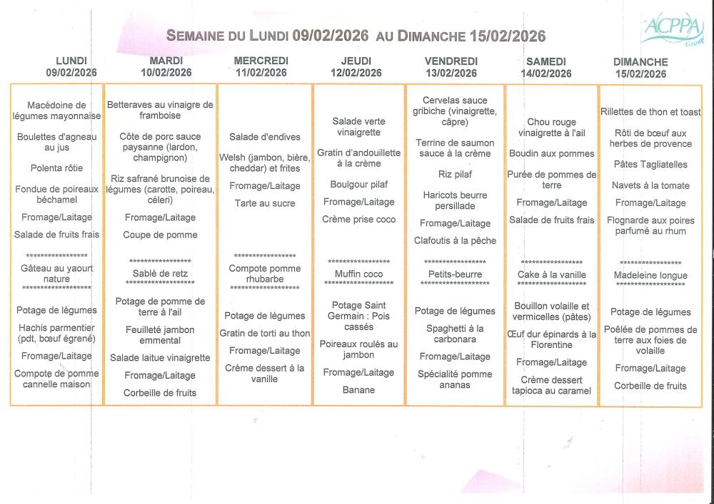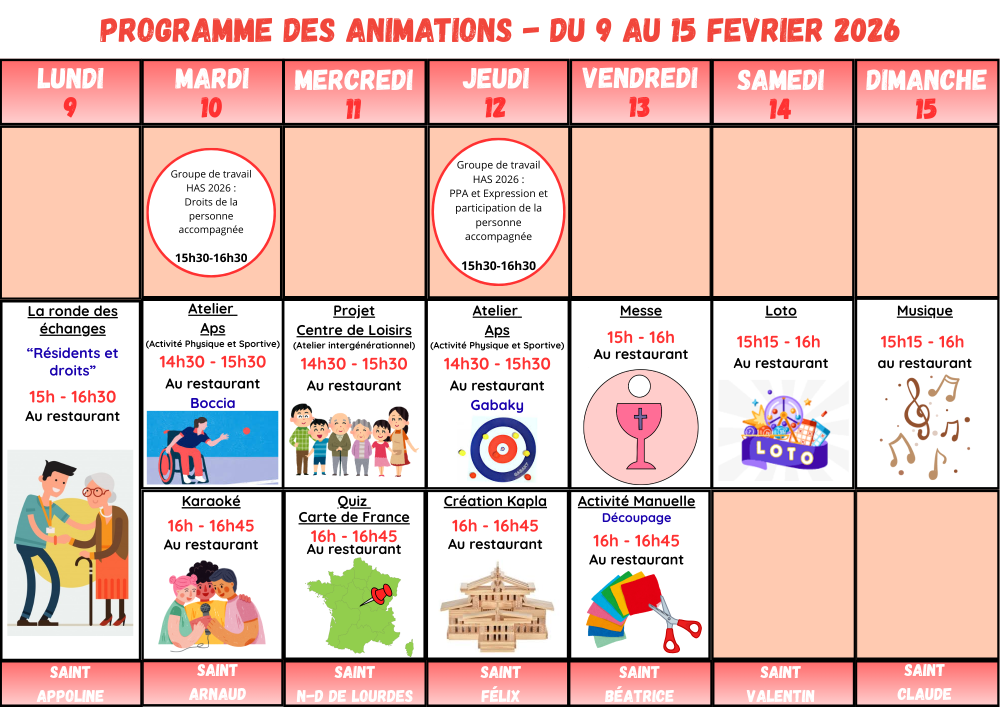 PROGRAMME DES ANIMATIONS et Menu du restaurant – Du 9 au 15 février 2026