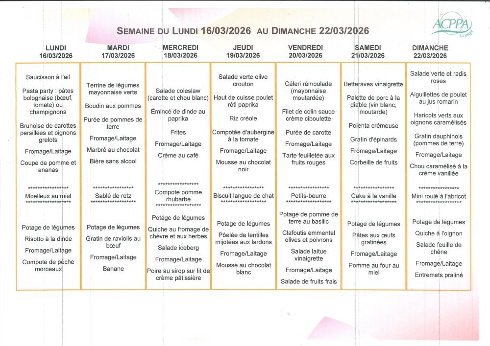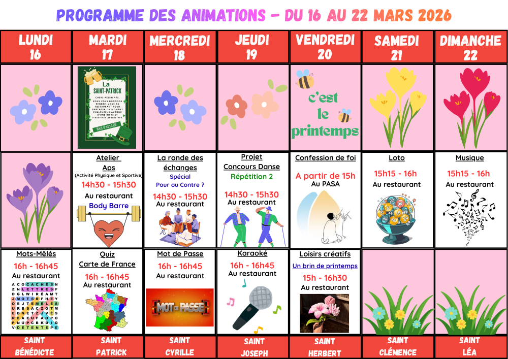 PROGRAMME DES ANIMATIONS ET MENU DU RESTAURANT – Du 16 au 22 MARS 2026