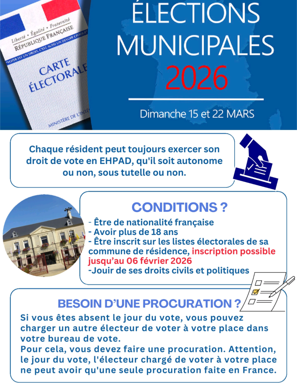 Les prochaines élections municipales auront lieu les 15 et 22 mars. Si vous n'êtes pas encore inscrits sur les listes électorales de Lourches, vous avez encore jusqu'au 06/02/26 pour le faire. Et nous serons heureux d'aider les résidents et les familles dans cette démarche 😊