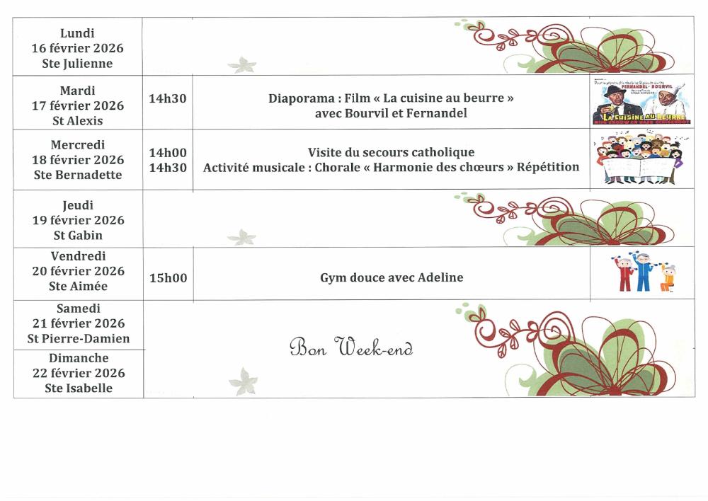 Francine l'animatrice est en congés du 16 au 22 février inclus. Mardi à 14h30 Cinéma: La cuisine au beurre. Mercredi Chorale à 14h30 Modification : Jeudi à 15h atelier manuel avec Marlise et Julie, création des décorations de carnaval. Vendredi 15h gym douce avec Adeline Bonne semaine.