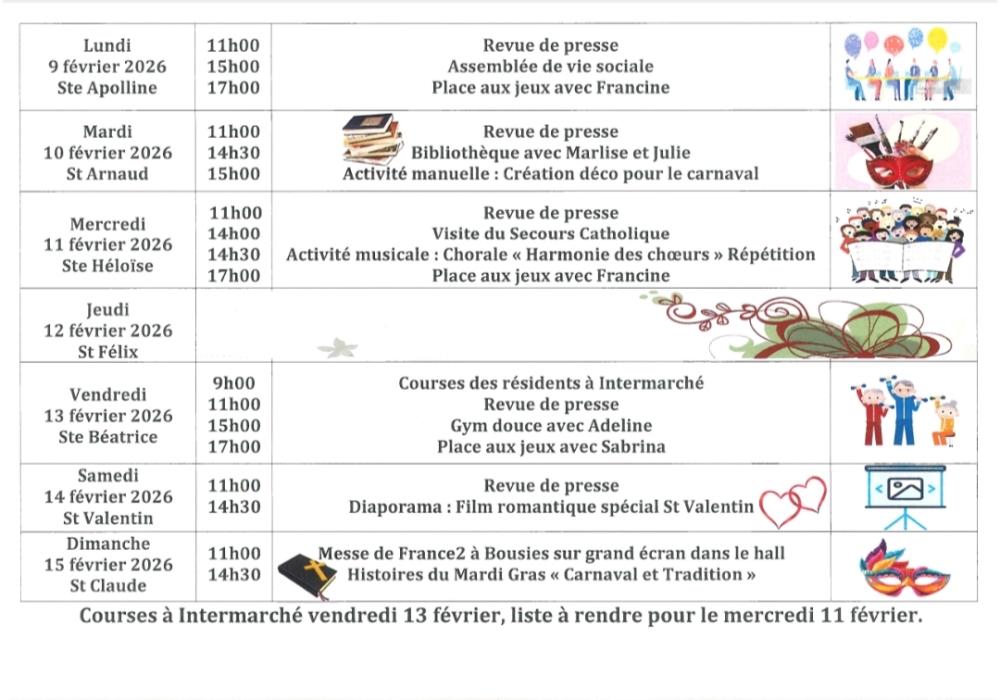 Passage de la bibliothèque mardi après midi ( Marlise et Julie) Samedi jour de la St Valentin, cinéma.