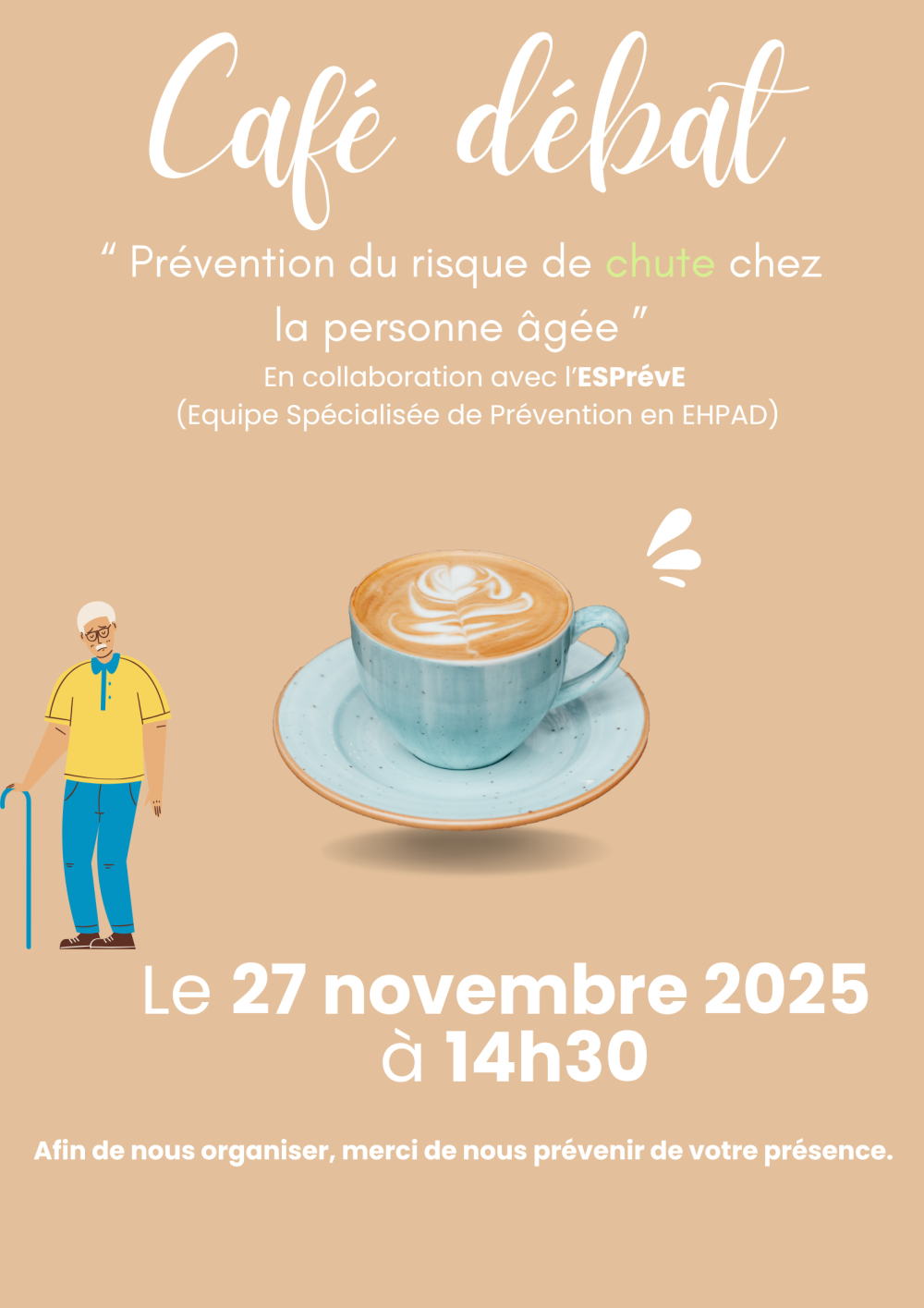 Bonjour l'équipe ESPREV organise un café débat avec les familles des résidents le 27/11/2025 à 14h30 sur la prévention du risque de chute chez la personne